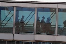 Жанровая фотография. Пассажиры из самолета по телескопическому трапу направляются в здание международного аэропорта "Домодедово" имени М.В. Ломоносова.