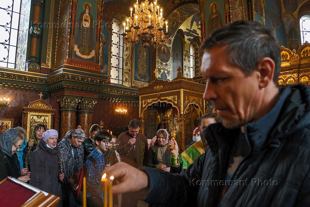 Празднование Вербного воскресения на подворье Оптиной Пустыни в Санкт-Петербурге. Жанровая фотография. Священнослужитель во время окропления веточек вербы святой водой.