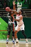 Евролига по баскетболу. Матч между командами УНИКС (Казань, Россия) - "Монако" (Монако, Франция) на стадионе "Баскет-холл". Игрок команды УНИКС Джордан Теодор (слева) и игрок команды "Монако" Руди Демаис-Баллу (справа) во время матча.