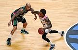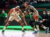Евролига по баскетболу. Матч между командами УНИКС (Казань, Россия) - "Монако" (Монако, Франция) на стадионе "Баскет-холл". Игрок команды УНИКС Айзея Канаан (справа) и игрок команды "Монако" Маркос Найт (слева) во время матча.