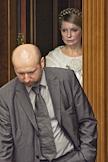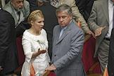 Народный депутат Украины, лидер Блока Юлии Тимошенко (БЮТ) Юлия Тимошенко (слева) и народный депутат Украины, лидер Партии промышленников и предпринимателей Украины (ПППУ) Анатолий Кинах (справа) во время заседания Верховной Рады Украины (ВРУ) пятого созыва.
