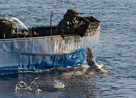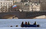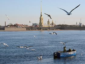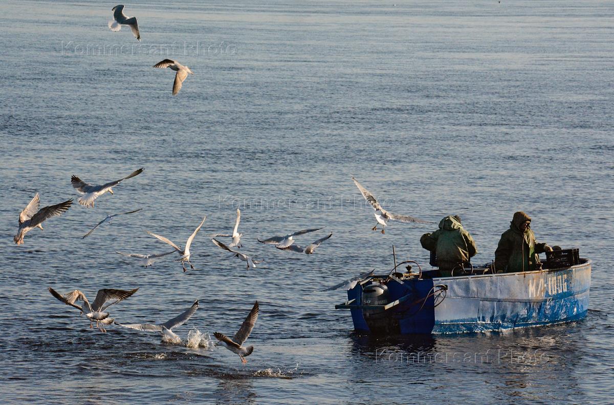 Виды Санкт-Петербурга. Жанровая фотография. Рыбаки в лодке во время лова корюшки на реке Неве.