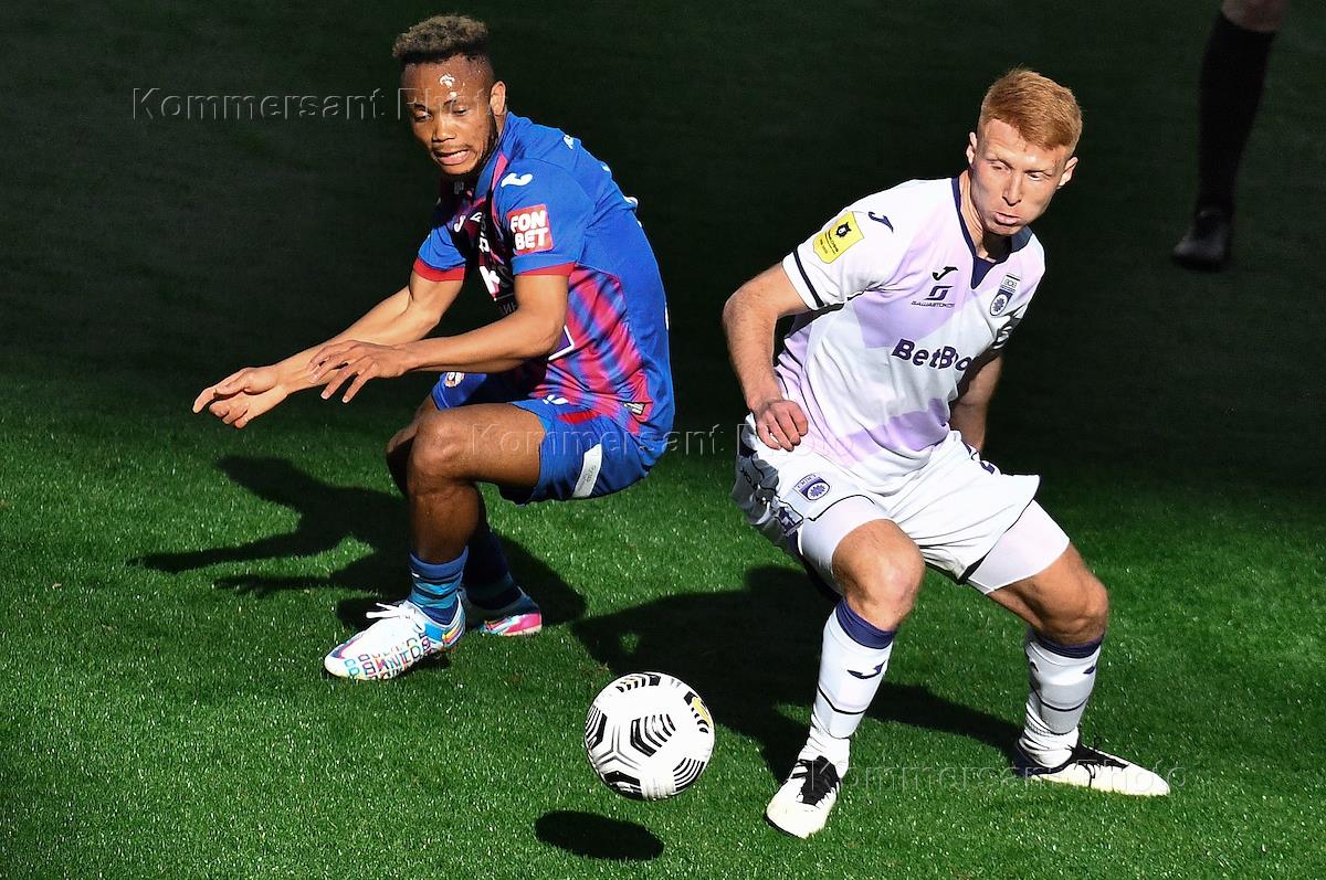 Российская Премьер-Лига (РПЛ). Тинькофф - Чемпионат России по футболу 2020/2021. 28-й тур. Матч между командами ЦСКА (Москва) — "Уфа" (Уфа) на стадионе "ВЭБ Арена". Игрок команды ЦСКА Чидера Эджуке (слева) и игрок команды "Уфа" Владислав Камилов (справа) во время матча.