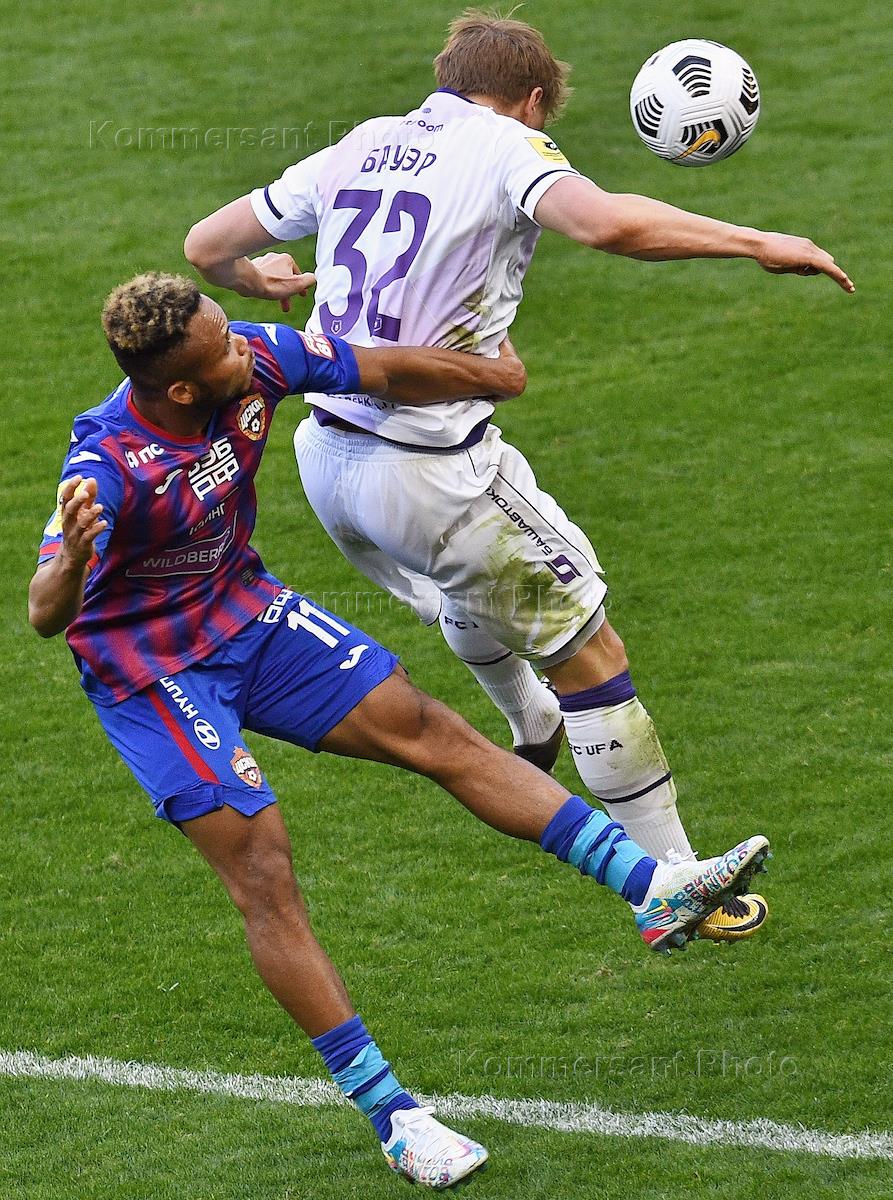 Российская Премьер-Лига (РПЛ). Тинькофф - Чемпионат России по футболу 2020/2021. 28-й тур. Матч между командами ЦСКА (Москва) — "Уфа" (Уфа) на стадионе "ВЭБ Арена". Игрок команды ЦСКА Чидера Эджуке (слева) и игрок команды "Уфа" Мориц Бауэр (справа) во время матча.