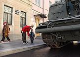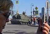 Репетиция военного парада в честь 76-й годовщины Победы в Великой Отечественной войне в Санкт-Петербурге. Жанровая фотография. Прохожие на набережной фотографируют проезжающую военную технику.