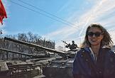 Репетиция военного парада в честь 76-й годовщины Победы в Великой Отечественной войне в Санкт-Петербурге. Жанровая фотография. Военная техника на набережной перед началом репетиции. Военнослужащий набирает воду из реки.