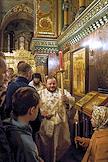 Жанровая фотография. Праздничное Пасхальное богослужение в храме Успения Пресвятой Богородицы Оптинского подворья. Священнослужитель во время богослужения.