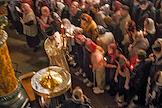 Жанровая фотография. Праздничное Пасхальное богослужение в храме Успения Пресвятой Богородицы Оптинского подворья. Священнослужитель и верующие во время богослужения.