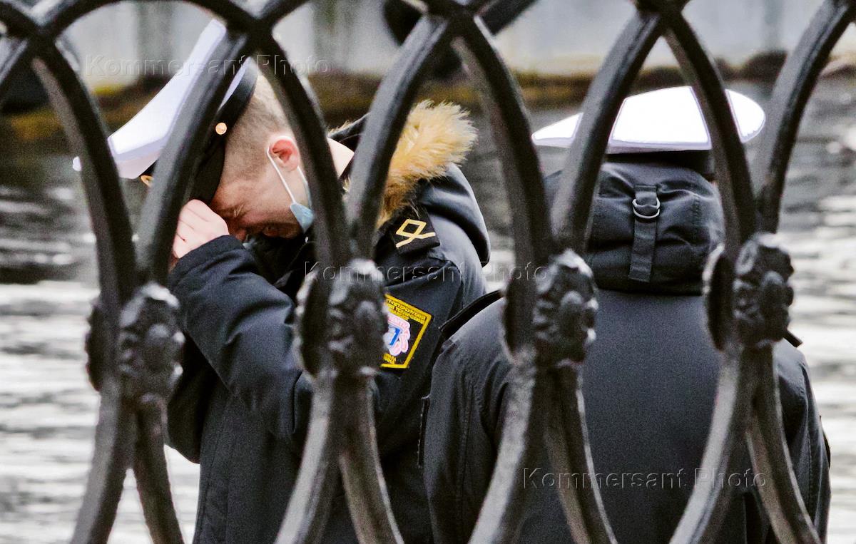 VII Фестиваль ледоколов и вальс буксиров в акватории Невы по случаю открытия туристического сезона в Санкт-Петербурге. Жанровая фотография. Моряки за решеткой ограды набережной.