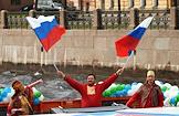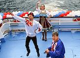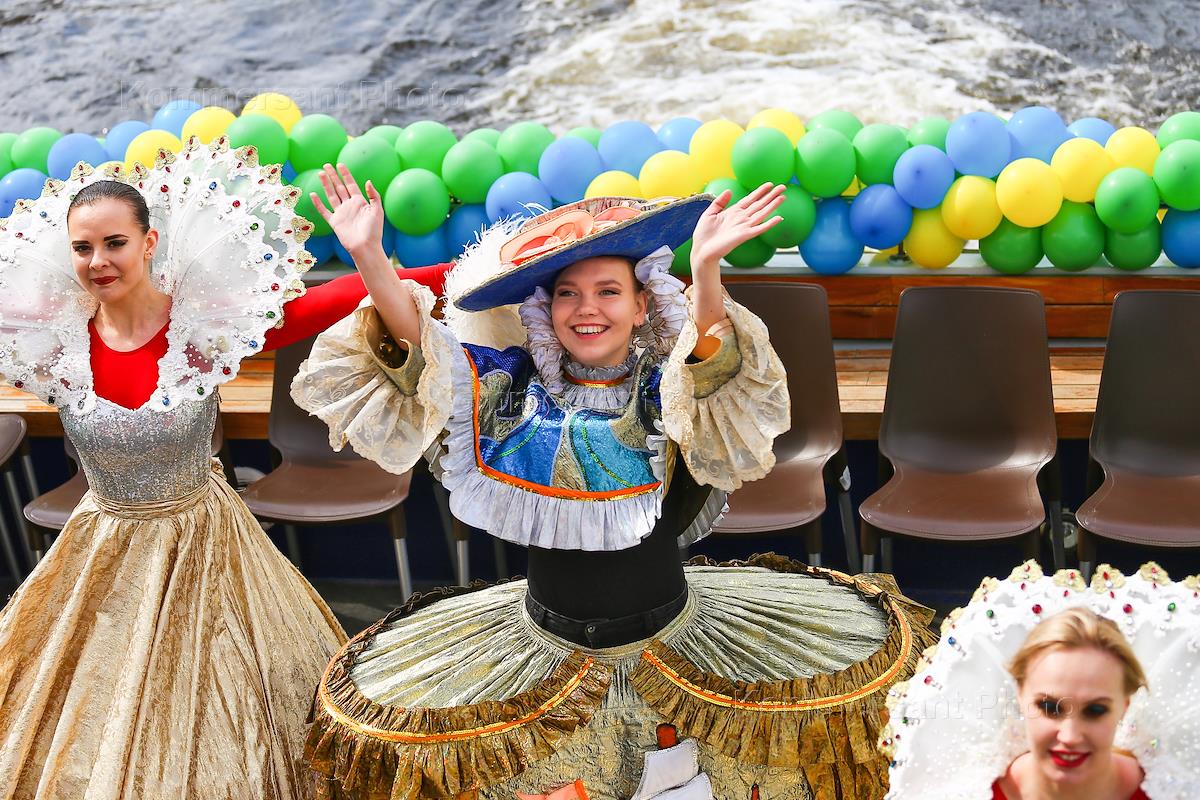 Участники речного карнавала, посвященного открытию туристического сезона в Санкт-Петербурге. Выступление народного ансамбля на речном корабле.