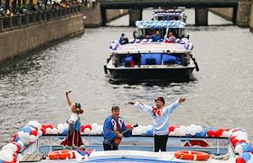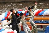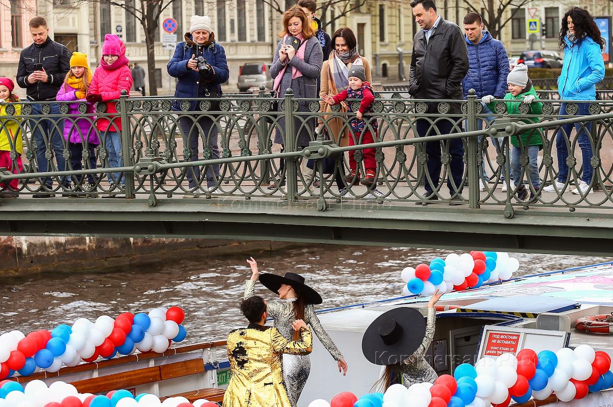 Участники речного карнавала, посвященного открытию туристического сезона в Санкт-Петербурге. Выступление эстрадного ансамбля на речном корабле.