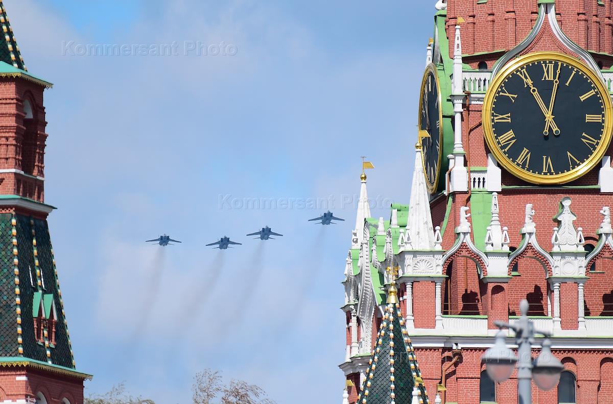 Репетиция парада, посвященного 76-й годовщины Победы в Великой Отечественной войне. Воздушная часть парада. Строй "тактическое крыло" из истребителей Су-30СМ, Су-35С и бомбардировщиков Су-34 во время репетиции.