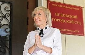 Журналистка Людмила Савицкая (в центре) во время судебного заседания Псковского городского суда по делу, в котором она оспаривает решение Министерства Юстиции России о признании ее иностранным агентом.