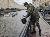 Репетиция военного парада в честь 76-й годовщины Победы в Великой Отечественной войне в Санкт-Петербурге. Жанровая фотография. Военная техника на набережной перед началом репетиции. Военнослужащий набирает воду из реки.