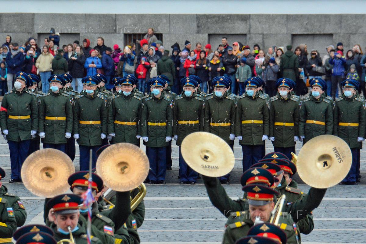 Репетиция военного парада в честь 76-й годовщины Победы в Великой Отечественной войне на Дворцовой площади. Военнослужащие во время репетиции.