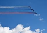 Генеральная репетиция парада, посвященного 76-й годовщины Победы в Великой Отечественной войне, на Красной площади. Стратегический бомбардировщик-ракетоносец Ту-160 и многоцелевые истребители Су-35С (группа высшего пилотажа "Русские витязи") во время генеральной репетиции воздушной части парада.