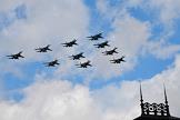 Генеральная репетиция парада, посвященного 76-й годовщине Победы в Великой Отечественной войне, на Красной площади. Строй "Кубинский бриллиант" групп высшего пилотажа "Русские витязи" на самолетах Су-30СМ и "Стрижи" на самолетах МиГ-29 во время генеральной репетиции воздушной части парада.