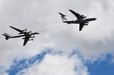 Генеральная репетиция парада, посвященного 76-й годовщины Победы в Великой Отечественной войне, на Красной площади. Стратегический бомбардировщик-ракетоносец Ту-95МС и самолет-заправщик Ил-78 во время генеральной репетиции воздушной части парада.