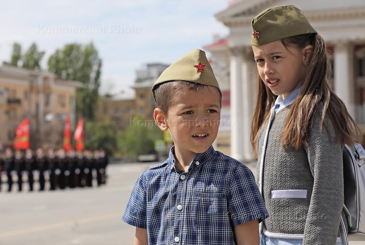 Генеральная репетиция парада, посвященного 76-й годовщине Победы в Великой Отечественной войне, на площади Павших Борцов в Волгограде. Жанровая фотография. Военнослужащий и мальчик перед началом генеральной репетиции парада.