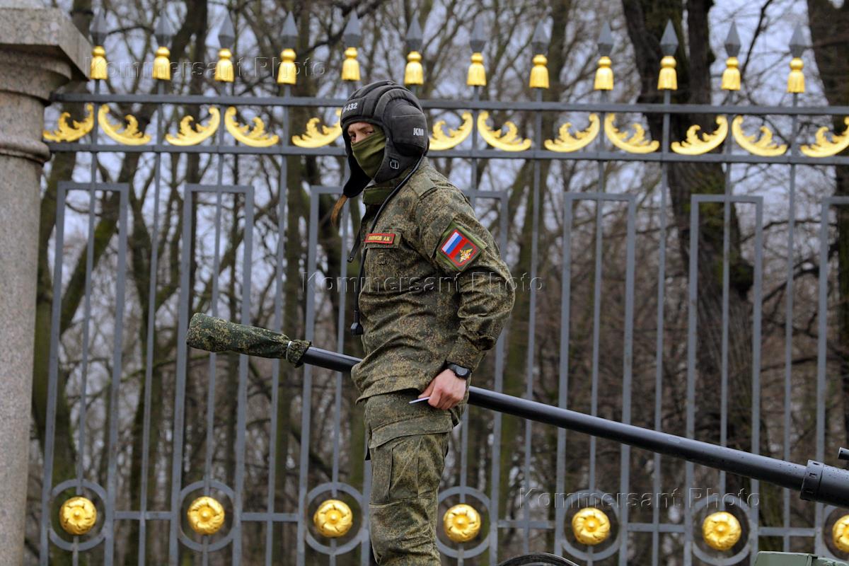 Генеральная репетиция парада, посвященного 76-й годовщины Победы в Великой Отечественной войне, на Дворцовой площади в Санкт-Петербурге. Военнослужащий перед началом генеральной репетиции парада.