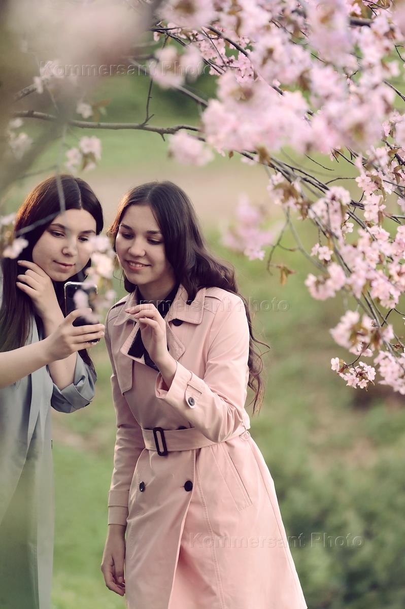 Жанровая фотография. Девушки у цветущей сакуры в Ботаническом саду.
