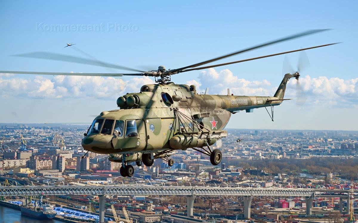 Празднование Дня Победы. Военный парад на дворцовой площади, посвященный 76-й годовщине Победы в Великой Отечественной войне. Многоцелевой вертолет Ми-8 во время воздушной части парада.