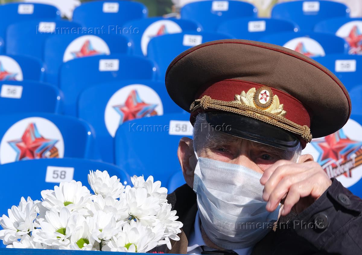Празднование Дня Победы. Военный парад на Дворцовой площади, посвященный 76-й годовщине Победы в Великой Отечественной войне. Ветераны на гостевой трибуне перед началом парада.