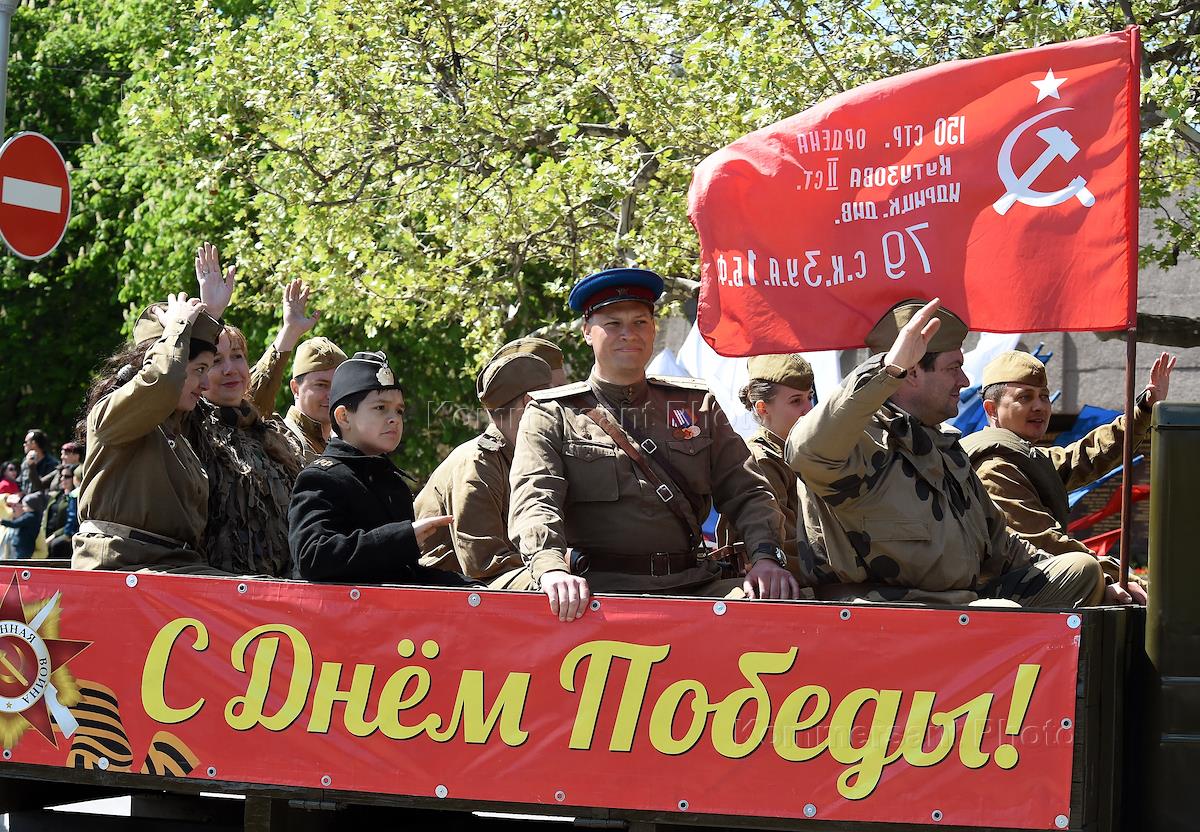 Празднование Дня Победы. Военный парад, посвященный 76-й годовщине Победы в Великой Отечественной войне и 77-летию освобождения города, прошел на площади Нахимова. Участники исторической реконструкции во время парада.