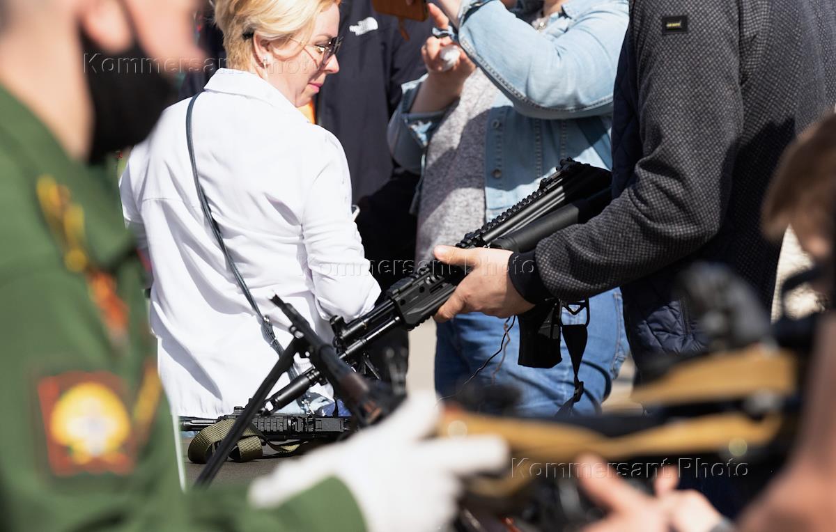 Празднование Дня Победы. Военный парад, посвященный 76-й годовщине Победы в Великой Отечественной войне, прошел на площади Тысячелетия. Посетители выставки военнизированной техники перед началом парада.