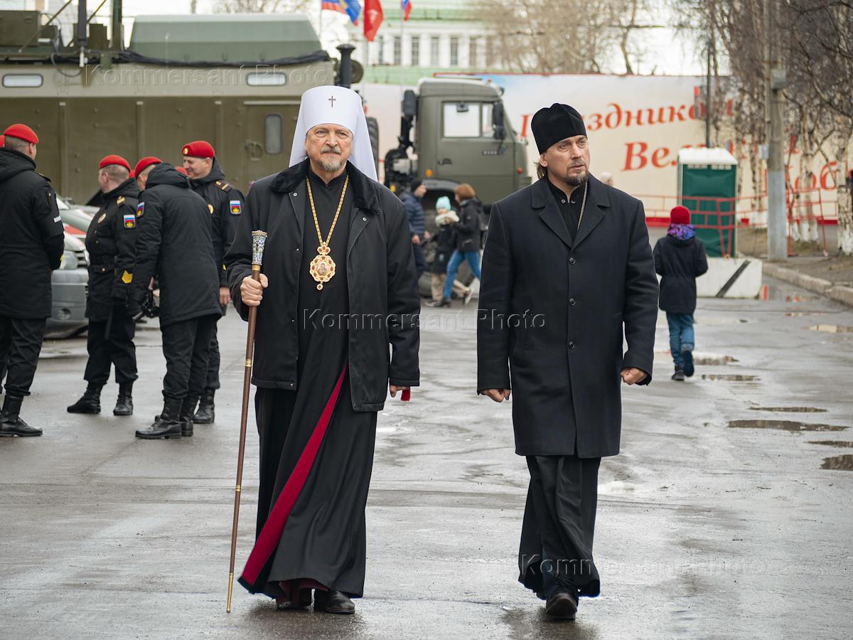 Военный парад, посвященный 76-й годовщине Победы в Великой Отечественной войне, прошел на площади Пять Углов. Митрополит Мурманский и Мончегорский Митрофан (в центре) перед началом парада.