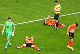Российская Премьер-Лига (РПЛ). Тинькофф - Чемпионат России по футболу 2020/2021. 29-й тур. Матч между командами "Урал" (Екатеринбург) и "Ростов" (Ростов-на-Дону) прошел на стадионе "Екатеринбург Арена". Вратарь команды "Урал" Ярослав Годзюр (слева) и главный судья Павел Шадыханов (второй справа) во время матча.