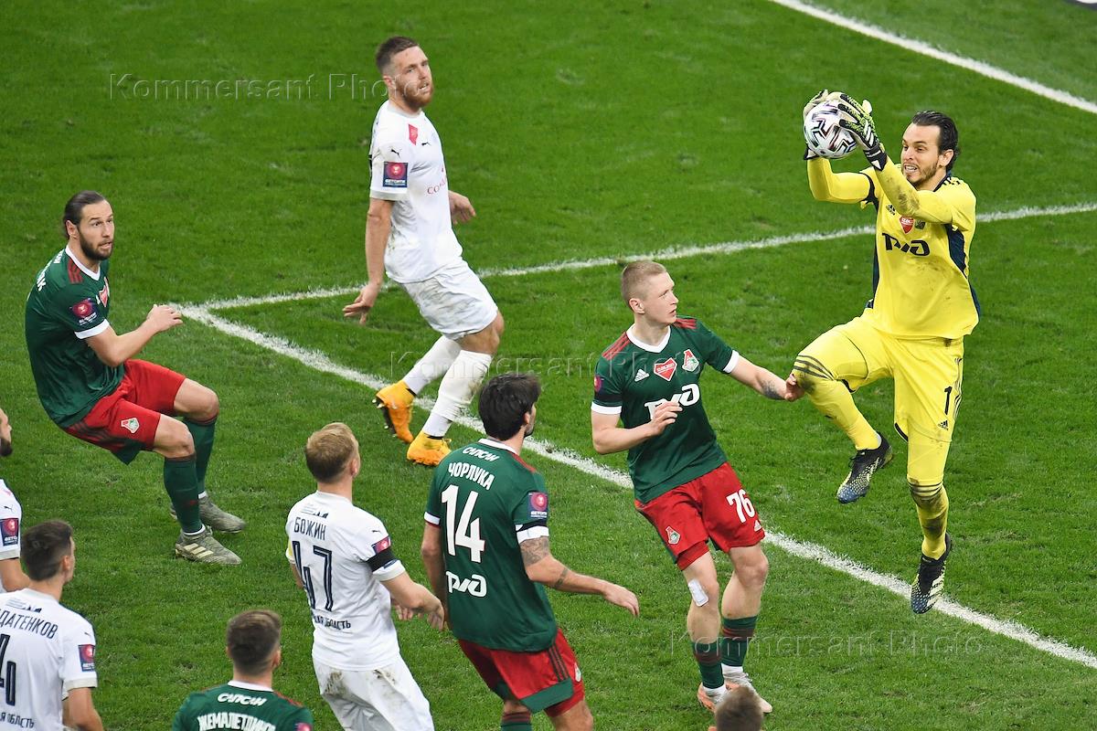 Финальный матч Бетсити Кубка России по футболу сезона 2020-2021 г. Матч между командами "Крылья Советов" (Самара) и "Локомотив" (Москва) на стадионе "Нижний Новгород". Вратарь команды "Локомотив" Маринато Гилерме (в центре) во время матча.