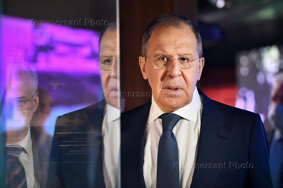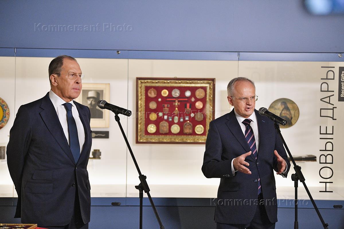 Торжественная церемония передачи директору Дома русского зарубежья им. Александра Солженицына Виктору Москвину архивных документов и личных вещей Н.Н.Баратова и А.Т.Ракитянского. Министр иностранных дел России Сергей Лавров во время церемонии.