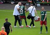 Российская Премьер-Лига (РПЛ). Тинькофф - Чемпионат России по футболу 2020/2021. 30-й тур. Матч между командами "Локомотив" (Москва) — "Урал" (Екатеринбург) на стадионе "РЖД Арена". Игрок команды "Локомотив" Франсуа Камано (в центре) с сотрудниками медицинской службы уходит с поля после полученной травмы во время матча.