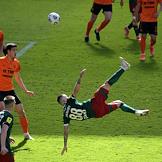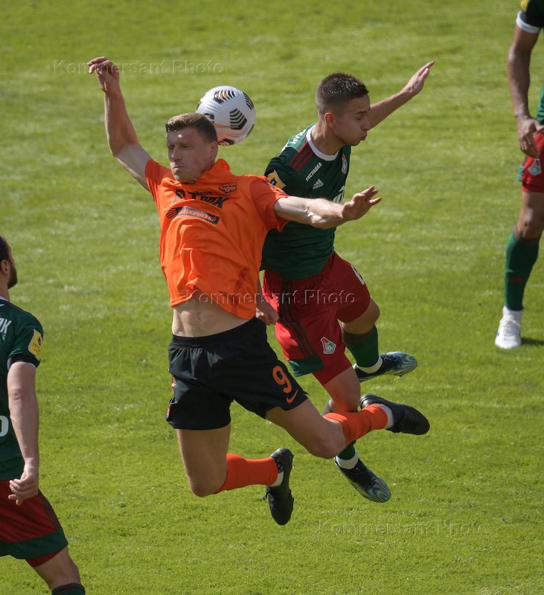 Российская Премьер-Лига (РПЛ). Тинькофф - Чемпионат России по футболу 2020/2021. 30-й тур. Матч между командами "Локомотив" (Москва) — "Урал" (Екатеринбург) на стадионе "РЖД Арена". Игрок команды "Локомотив" Гжегож Крыховяк (второй справа) и вратарь команды "Урал" Ярослав Годзюр (справа) во время матча.