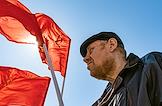 Празднование Дня Победы. Мужчина с красным флагом на Дворцовой площади.