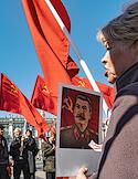 Празднование Дня Победы. Люди с красными флагами и портретом Иосифа Сталина на Дворцовой площади.