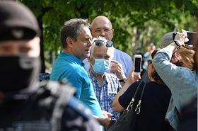 Вынесение приговора лидеру движения "За новый социализм" Николаю Платошкину по делу о призывах к массовым беспорядкам и публичном распространении заведомо ложной информации в Гагаринском районном суде. Сторонники движения "За новый социализм" и сотрудники полиции у здания суда.