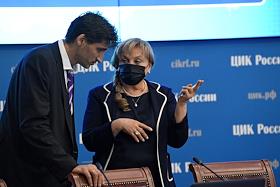 Заседание Центральной избирательной комиссии (ЦИК) России. Председатель ЦИК России Элла Памфилова (справа) и заместитель министра цифрового развития и массовых коммуникаций России Олег Качанов (слева) перед началом заседания.