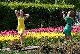 Жанровая фотография. Парк Горького. Девушки фотографируются на мобильный телефон у клумбы с тюльпанами.