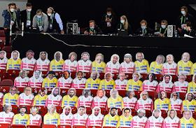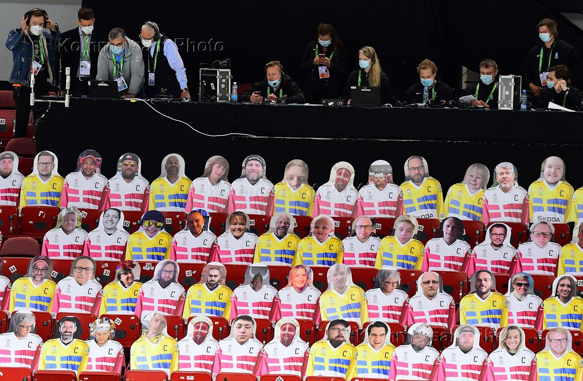 Чемпионат мира по хоккею 2021. Матч между сборными Дании и Швеции на стадионе Олимпийского спортивного центра. Жанровая фотография. Трибуны с картонными зрителями.