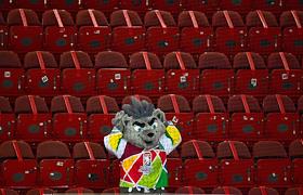 Чемпионат мира по хоккею 2021. Матч между сборными Дании и Швеции на стадионе Олимпийского спортивного центра. Жанровая фотография. Талисман соревнований - ежик Спайки на трибуне.