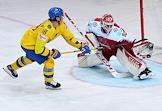 Чемпионат мира по хоккею 2021. Матч между сборными Дании и Швеции на стадионе Олимпийского спортивного центра. Вратарь сборной Дании Себастьян Дам (справа) и игрок сборной Швеции Виктор Олофссон (слева) во время матча.