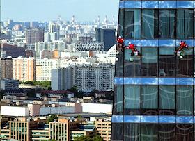 Московский международный деловой центр "Москва-Сити". Жанровая фотография. Мытье окон башни "Федерация" промышленными альпинистами.