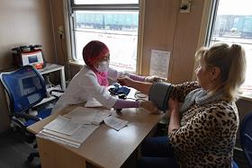 Экологический пресс-тур на Байкал. Виды Иркутска. Жанровая фотография. Пациенты во время приема в Передвижном консультативно-диагностическом центре "Академик Федор Углов" на станции Половина.