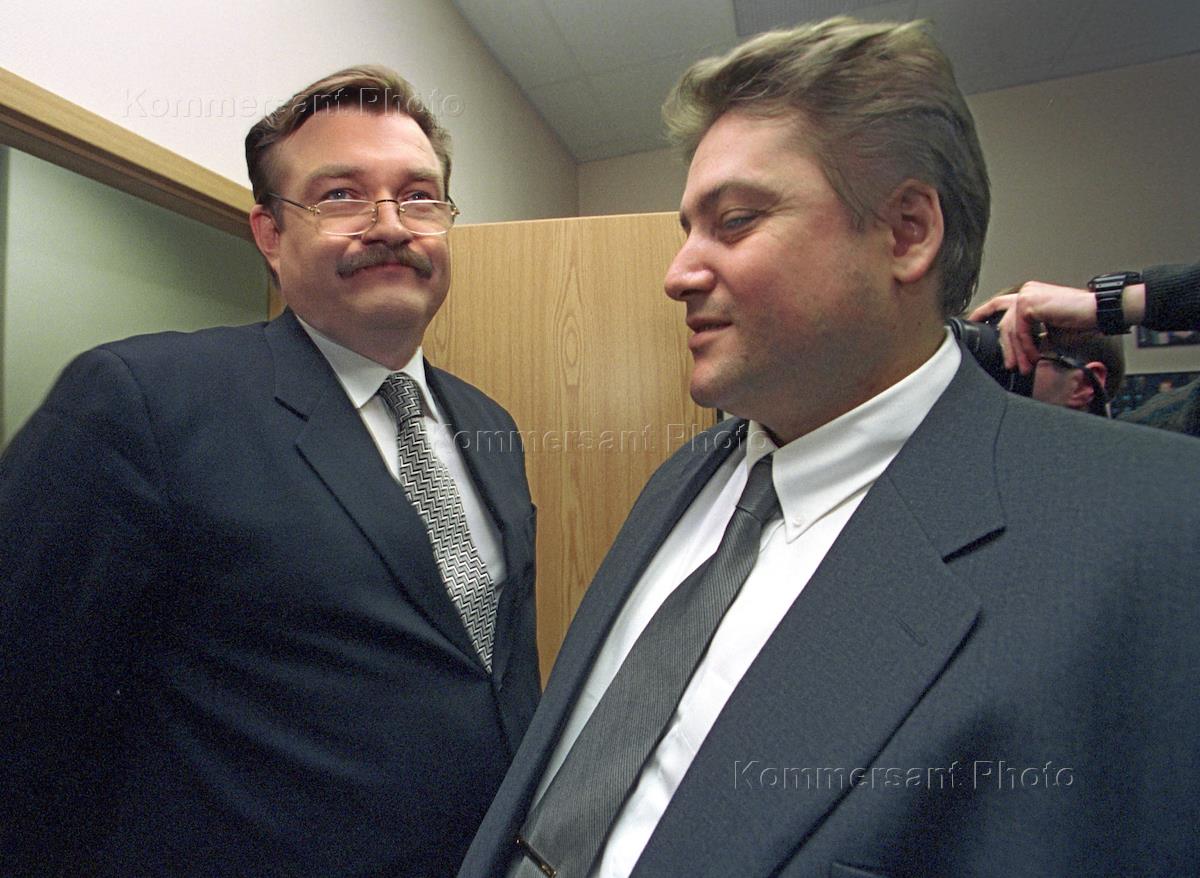 Генеральный директор НТВ Евгений Киселев (слева) и лидер движения "Яблоко" Григорий Явлинский (справа) перед экстренным выпуском программы "Итоги", посвященной смене руководства на НТВ. Причиной конфликта между НТВ и "Газпром-медиа" стало решение саратовского суда о легитимности собрания акционеров. Собрание назначило новое руководство компанией.