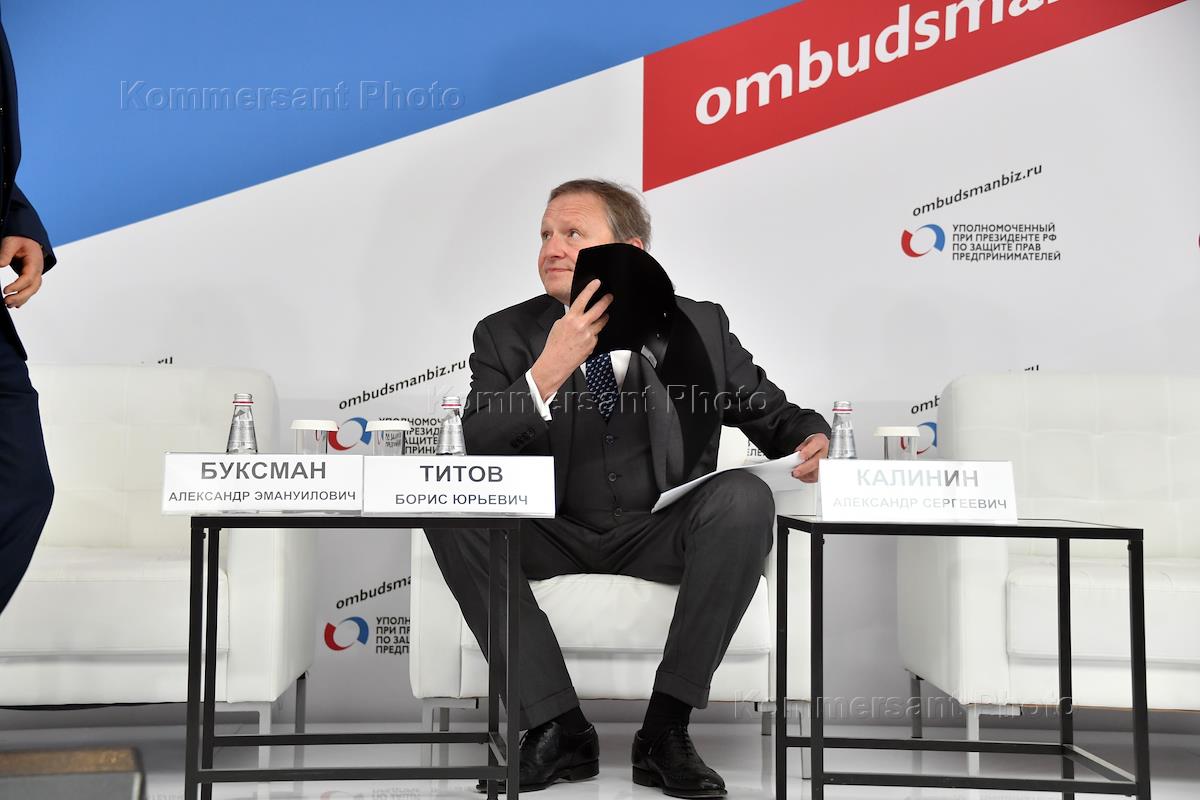 XV Всероссийская конференция уполномоченных по защите прав предпринимателей в Центре международной торговли (ЦМТ). Уполномоченный при президенте России по защите прав предпринимателей Борис Титов (слева) во время конференции.