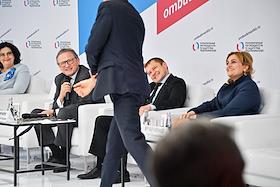 XV Всероссийская конференция уполномоченных по защите прав предпринимателей в Центре международной торговли (ЦМТ). Слева напрво: вице-президент торгово-промышленной палаты России Елена Дыбова, первый заместитель Генерального прокурора России Александр Буксман и уполномоченный при президенте России по защите прав предпринимателей Борис Титов во время конференции.