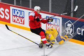 Чемпионат мира по хоккею 2021. Матч между сборными Швейцарии и Швеции на стадионе Олимпийского спортивного центра. Игрок сборной Швейцарии Фабиан Хельднер (в центре) и игрок сборной Швеции Виктор Олофссон (справа) во время матча.