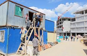Визит министра просвещения России Сергея Кравцова в Нижний Новгород. Жанровая фотография. Работы по строительству корпуса "Школы 800" в микрорайоне Верхние Печеры. Рабочие возле жилых вагончиков на территории стройки.